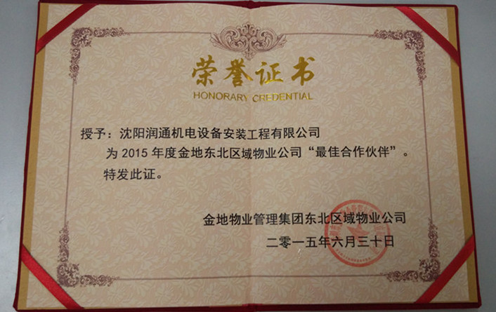 2015年6月30日,金地物業(yè)管理集團東北區(qū)域物業(yè)公司授予沈陽潤通機電設備安裝工程有限公司為2015年度金地東北區(qū)域物業(yè)公司“最佳合作伙伴”榮譽證書,自2013年11月與金地名京一期、二期簽訂電梯維保合同至今,潤通人堅持24小時熱線不間斷,12個月度維保報告不松懈,年度電梯故障分析準確到位,客戶響應及時、到位等優(yōu)秀品質(zhì),獲得了業(yè)主的好評。這份榮譽不僅說明了我們的工作得到了客戶的認可,更印證了我們的努力是值得的,同時更是鞭策我們不斷提高,深挖潛力的動力,讓我們不停的努力和改進去完善服務內(nèi)容和服務品質(zhì),做專屬于潤通的優(yōu)秀維保服務。